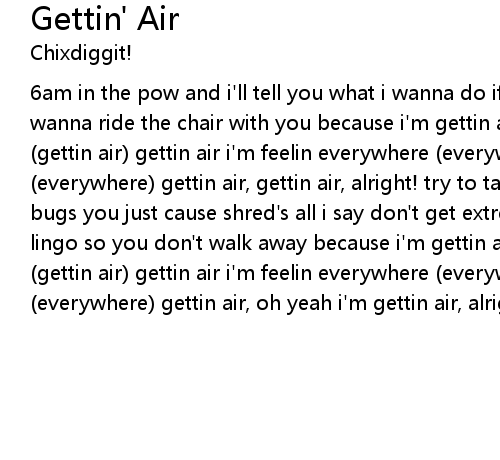 6am in the pow and i'll tell you what i wanna do if i ever had my way i'd just wanna ride the chair with you because i'm gettin air (gettin air) gettin air (gettin air) gettin air i'm feelin everywhere (everywhere) everywhere (everywhere) gettin air, gettin air, alright! try to talk, i can tell that it bugs you just cause shred's all i say don't get extreme i just try to talk the lingo so you don't walk away because i'm gettin air (gettin air) gettin air (gettin air) gettin air i'm feelin everywhere (everywhere) everywhere (everywhere) gettin air, oh yeah i'm gettin air, alright! |