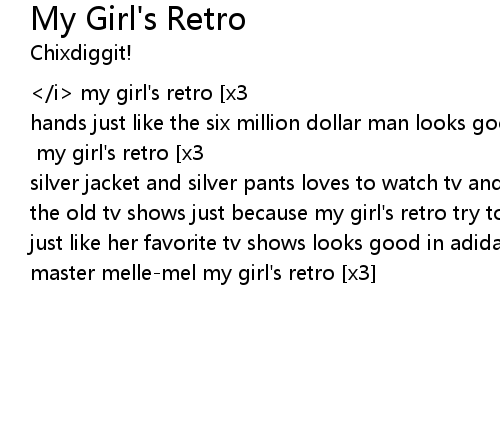 my girl's retro <i>[x3]</i> my girl's retro [x3] scooby doo lunch pail in her hands just like the six million dollar man looks good in adidas gazelles ass like grand master melle-mel my girl's retro [x3] my girl's retro [x3] wears a silver jacket and silver pants loves to watch tv and loves to dance i know all the old tv shows just because my girl's retro try to catch up to 20 years ago just like her favorite tv shows looks good in adidas gazelles ass like grand master melle-mel my girl's retro [x3] |