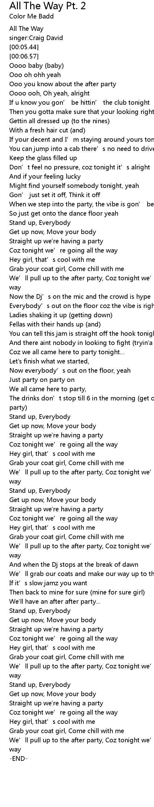 | [02:16.18] | We’ll pull up to the after party, Coz tonight we’re going all the way |