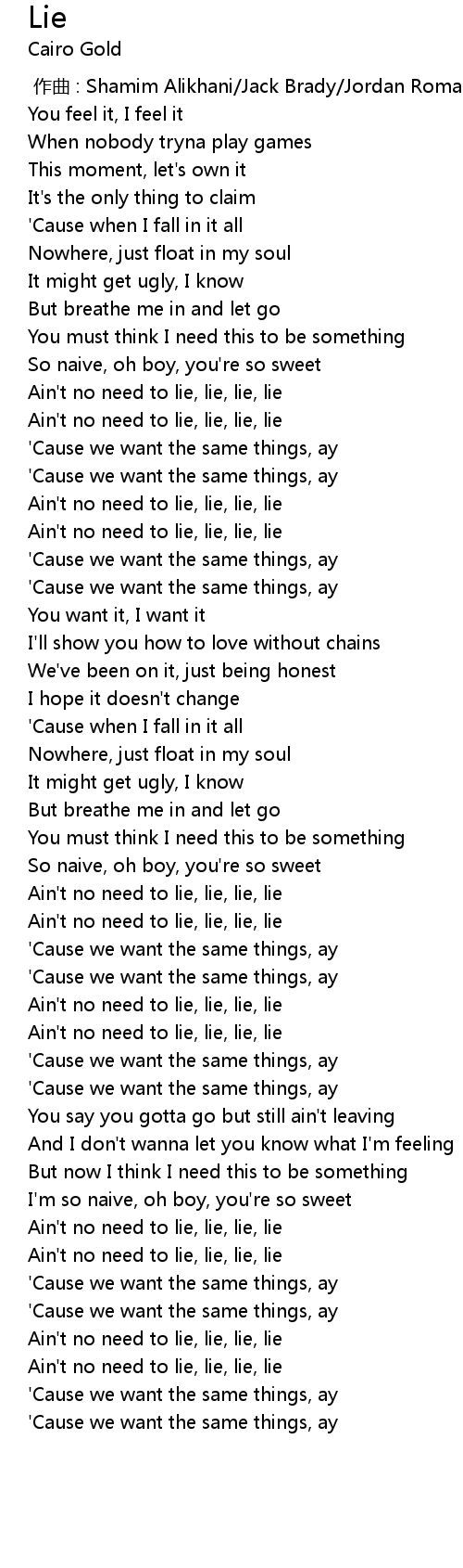| [01:02.43] | Ain' t no need to lie, lie, lie, lie |