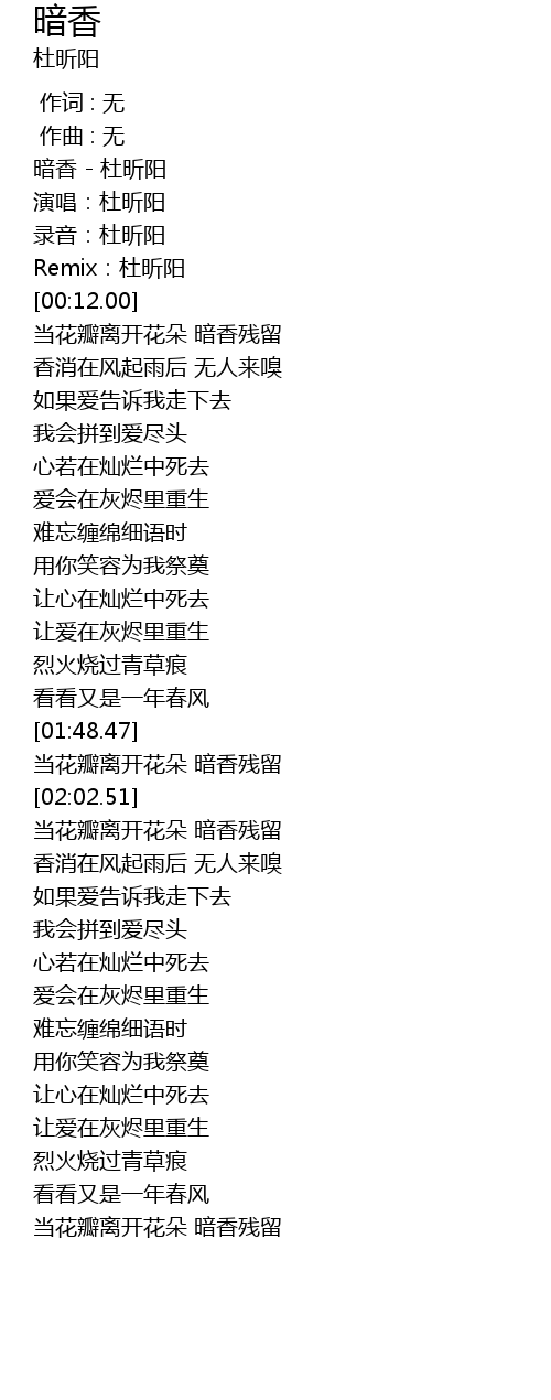 | [00:00.00] | 暗香 - 杜昕阳 |