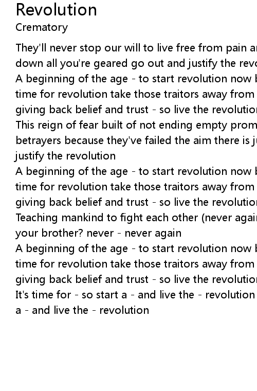 A beginning of the age - to start revolution now break and leave their cage - time for revolution take those traitors away from us - let's start revolution giving back belief and trust - so live the revolution |