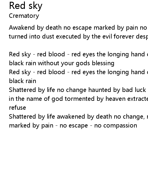 Red sky - red blood - red eyes the longing hand of faith red sky - dead land - black rain without your gods blessing |