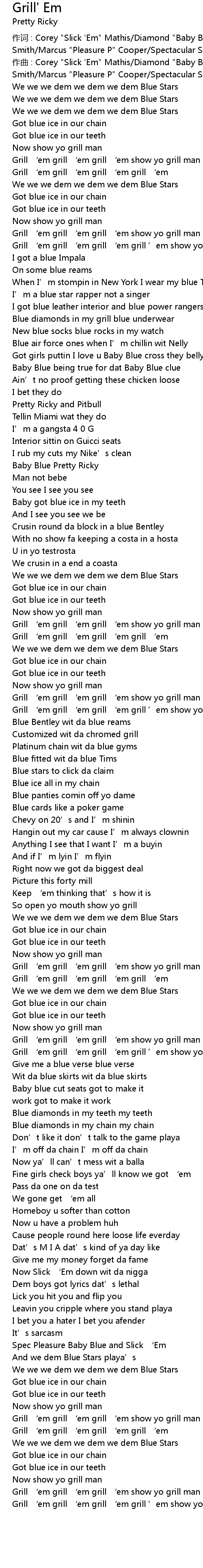 | 作词 : Corey "Slick 'Em" Mathis/Diamond "Baby Blue"/Joseph "BlueStar" Smith/Marcus "Pleasure P" Cooper/Spectacular Smith | |