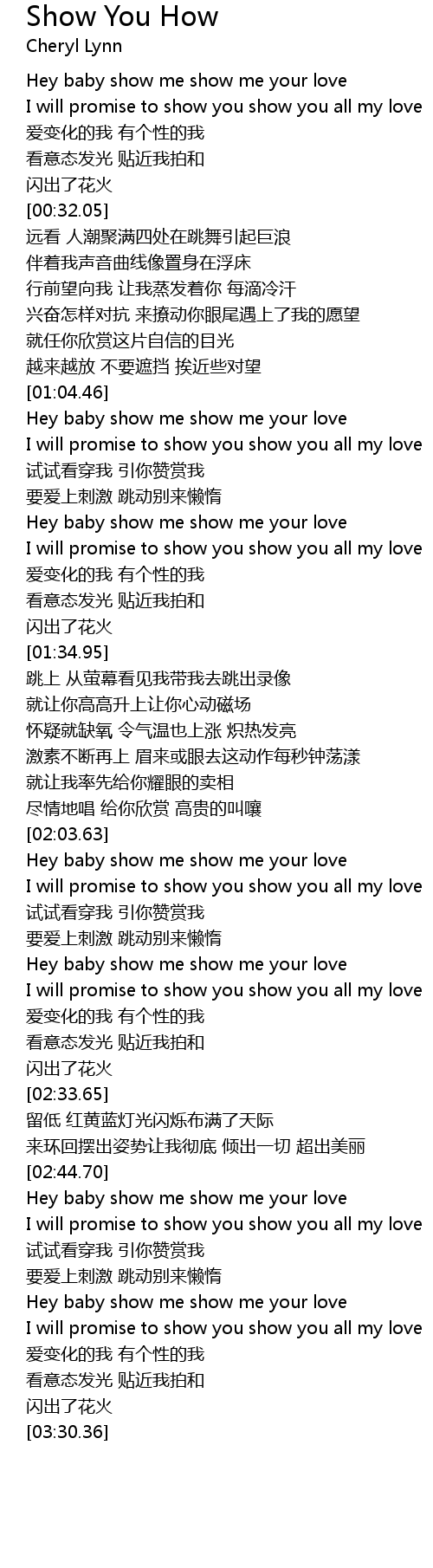 | [03:14.04] | Hey baby show me show me your love |