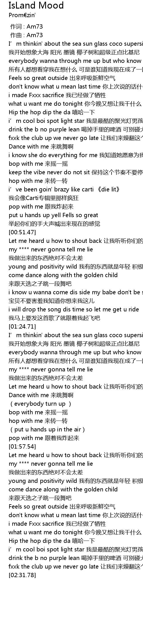 | [00:44.40] | i’ve been goin' brazy like carti 《die lit》 我会像Carti专辑里那样疯狂 |