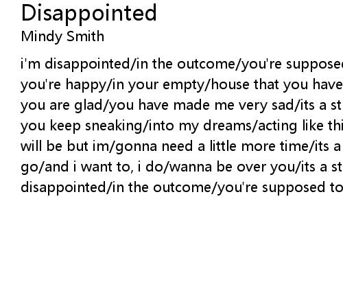 i'm disappointed/in the outcome/you're supposed to be my one and only/i hope you're happy/in your empty/house that you have cleansed of me/and it looks like you are glad/you have made me very sad/its a struggle just to let you go/when you keep sneaking/into my dreams/acting like things are fine and dandy/and it will be but im/gonna need a little more time/its a struggle just to let you go/and i want to, i do/wanna be over you/its a struggle just to let you go/im disappointed/in the outcome/you're supposed to be my one and only. |