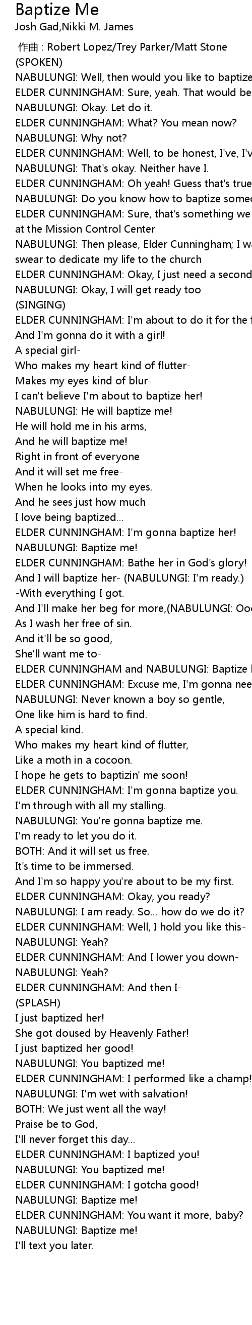 | [00:35.206] | NABULUNGI: Then please, Elder Cunningham; I want to be baptized. I swear to dedicate my life to the church |