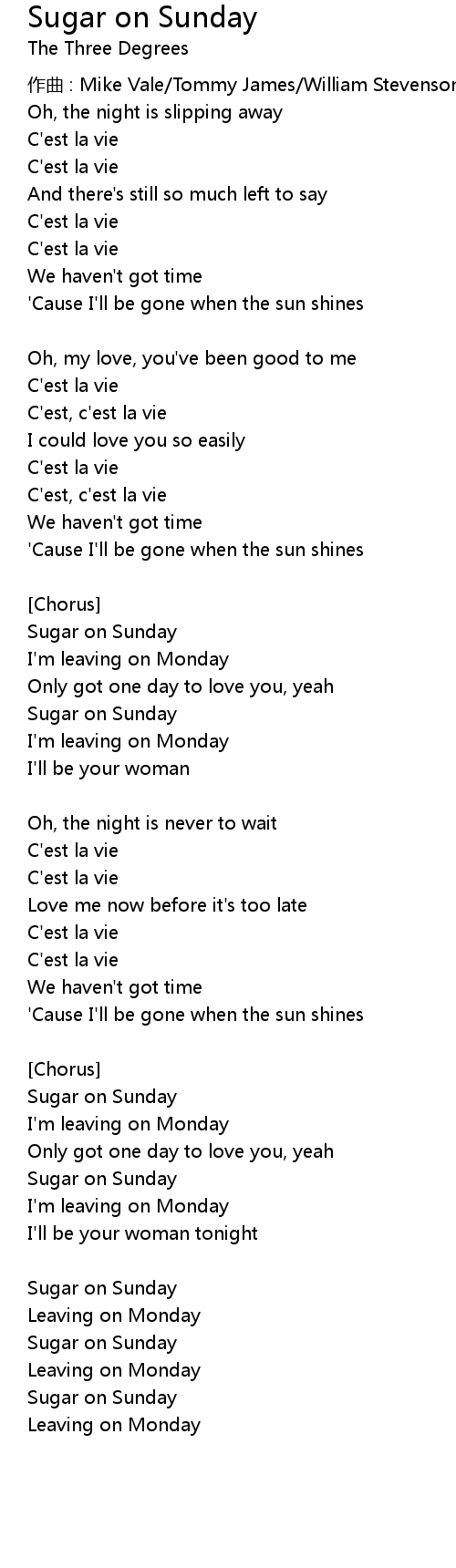 | Song | Sugar on Sunday |
