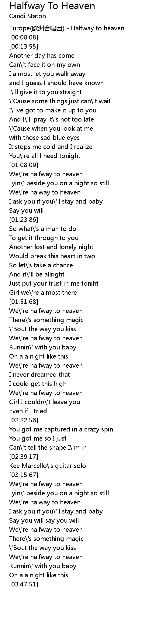 | [00:00.98] | Europe(欧洲合唱团) - Halfway to heaven |