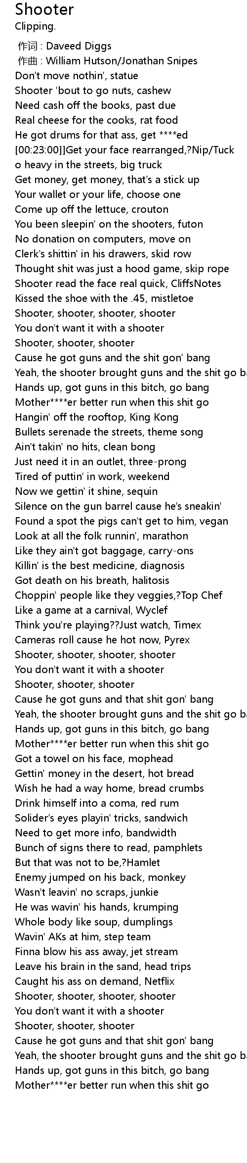| [00:14:00] | Shooter ' bout to go nuts, cashew |
