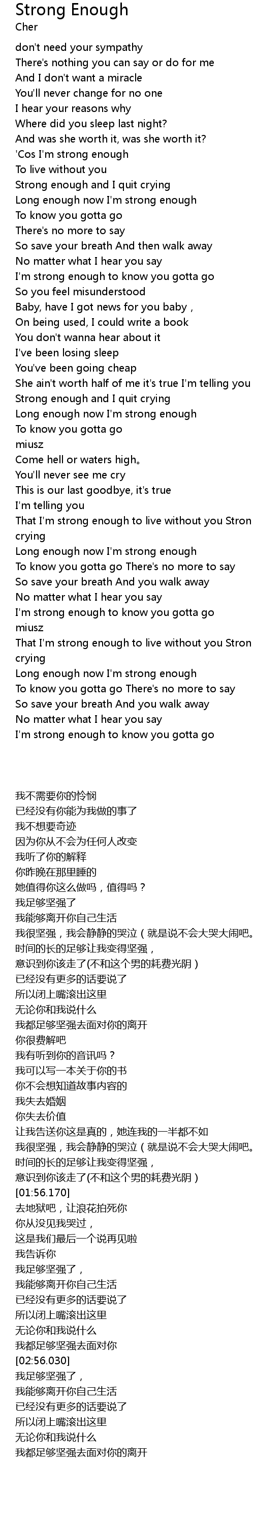 | [02:25.160] | That I'm strong enough to live without you Stron enough and I quit crying |