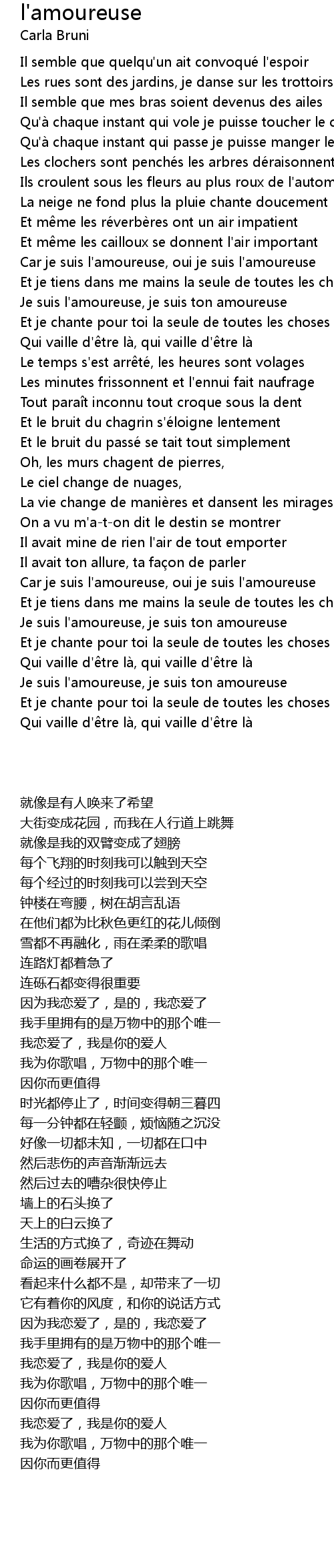 | [02:06.01] | Car je suis l' amoureuse, oui je suis l' amoureuse |