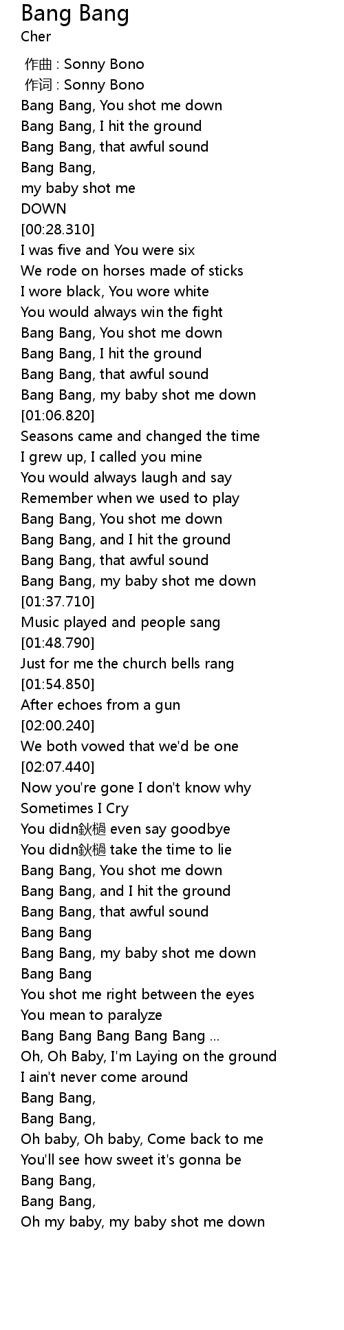 | [02:55.130] | Bang Bang, my baby shot me down |