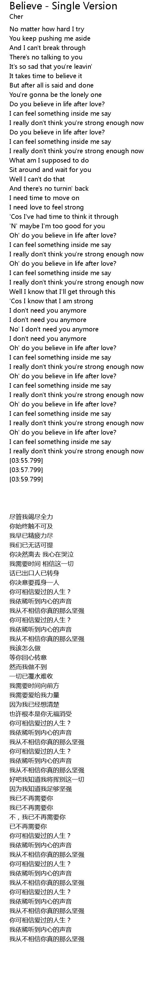 | [02:59.799] | Oh' do you believe in life after love? |