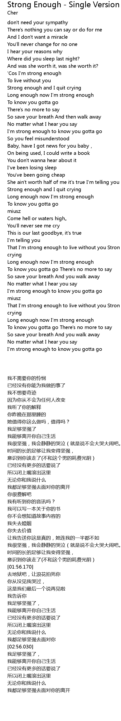 | [02:25.160] | That I' m strong enough to live without you Stron enough and I quit crying |