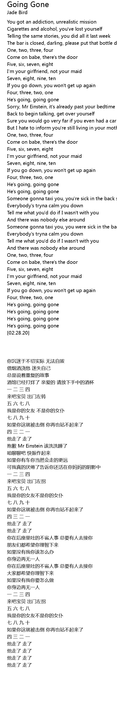 | [00:38.33] | Seven, eight, nine, ten |