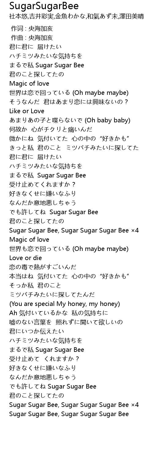 | [00:10.000] | まるで私 Sugar Sugar Bee |