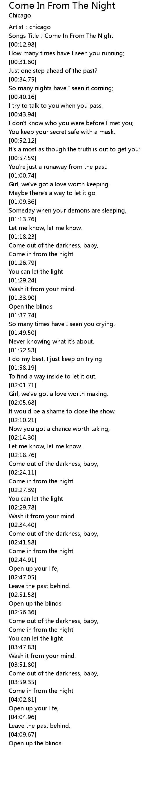 | [00:05.87] | Songs Title: Come In From The Night |