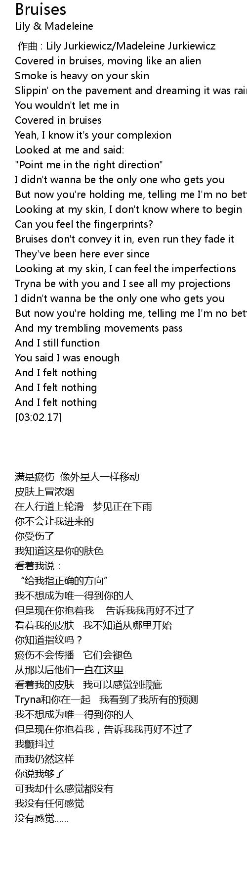 | [00:33.08] | Covered in bruises, moving like an alien |