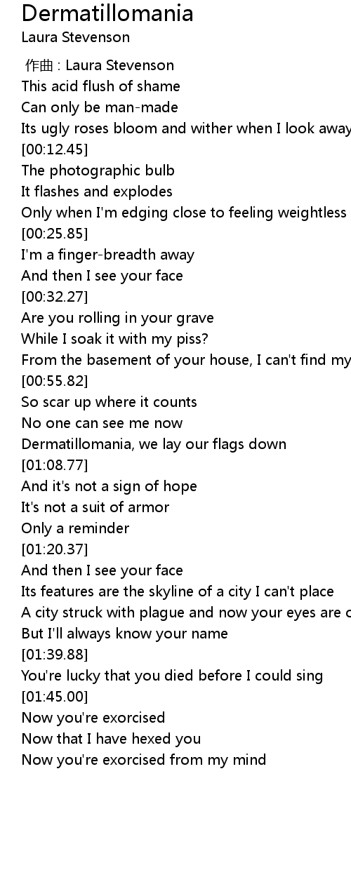 | [01:03.24] | Dermatillomania, we lay our flags down |