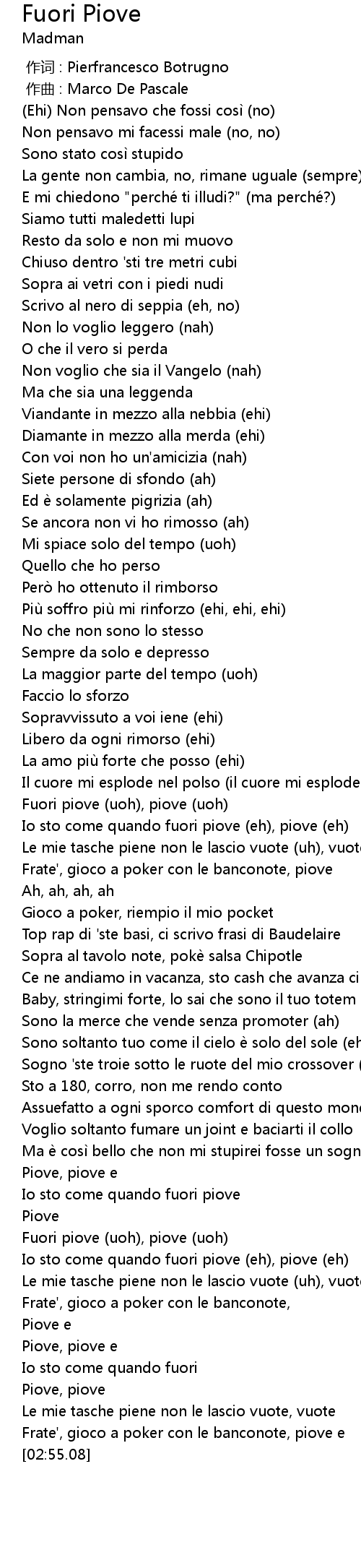 | [02:09.74] | Fuori piove (uoh), piove (uoh) |