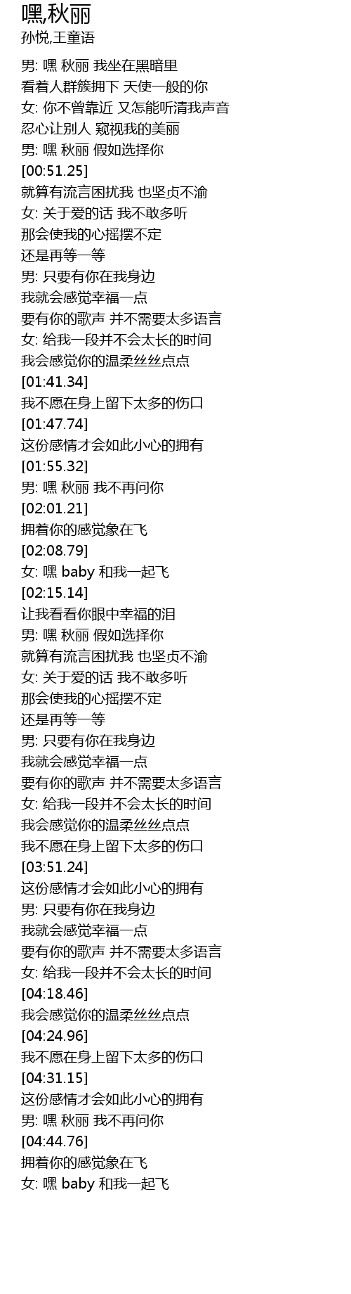 | [04:51.32] | 女: 嘿 baby 和我一起飞 |