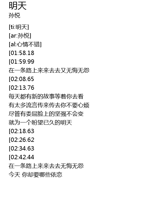 | [01:20.09][02:34.63][03:27.79][03:59.67] | míng tiān yǒu tài duō yòu rén de huà miàn |