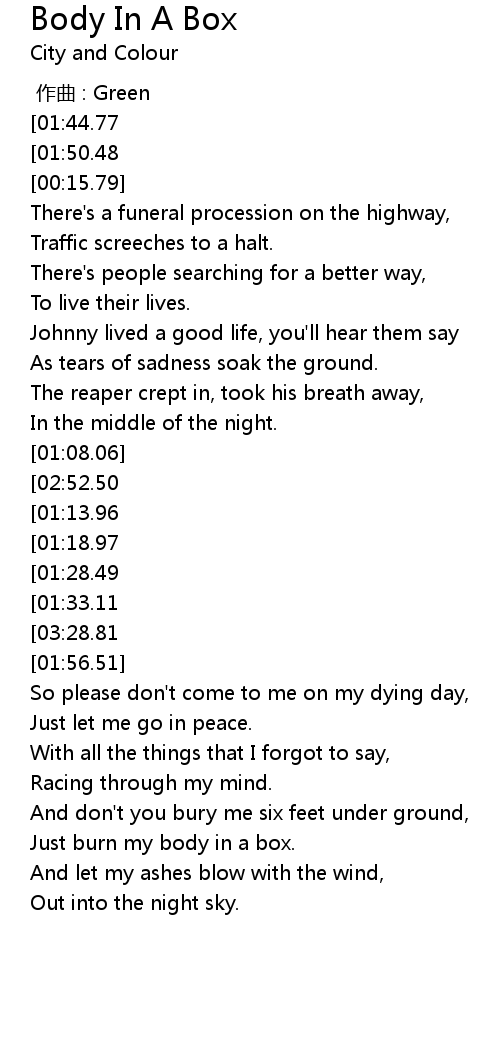 | [03:51.34][01:44.77][00:01.15] | City and Colour Body in a Box |