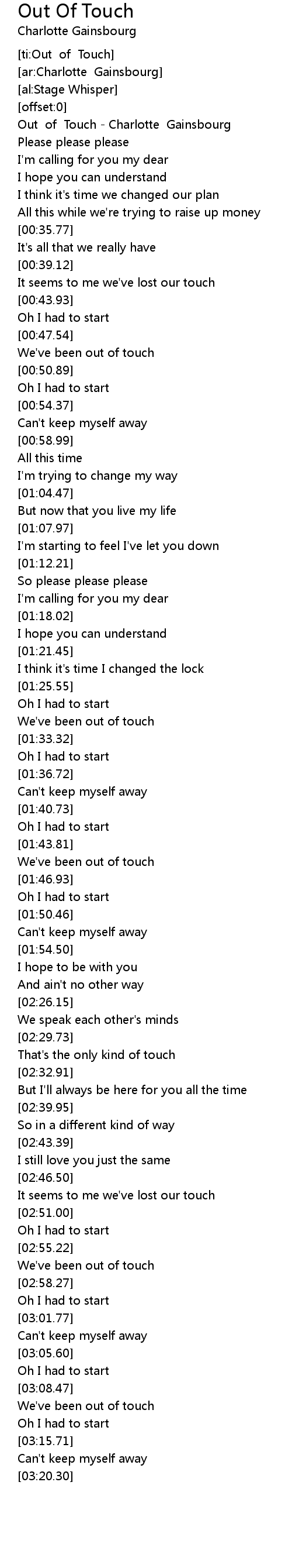 [00:03.81] Out of Touch - Charlotte Gainsbourg