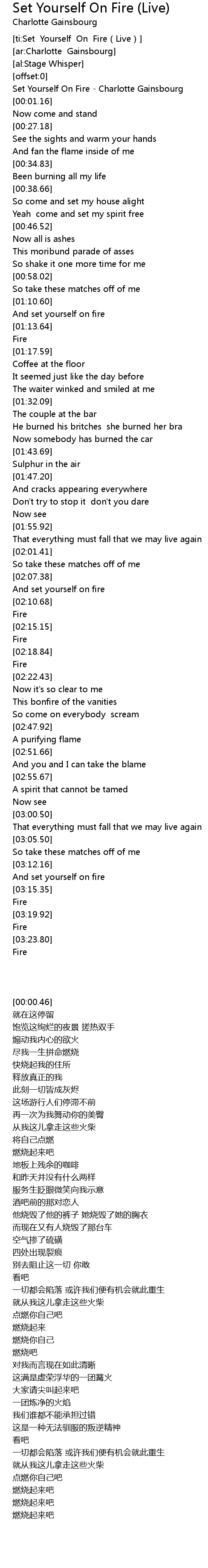 | [00:00.46] | Set Yourself On Fire Charlotte Gainsbourg |