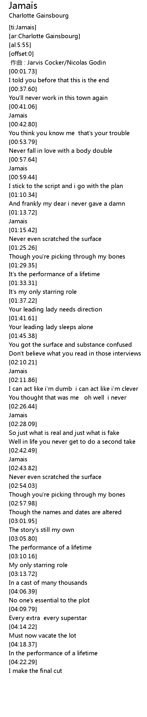 | [00:00.00] | 作曲 : Jarvis Cocker/Nicolas Godin |