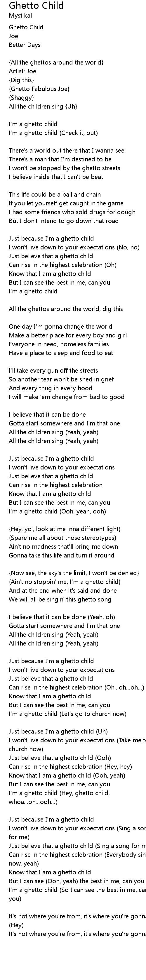 {Ain't no stoppin' me, I'm a ghetto child} |