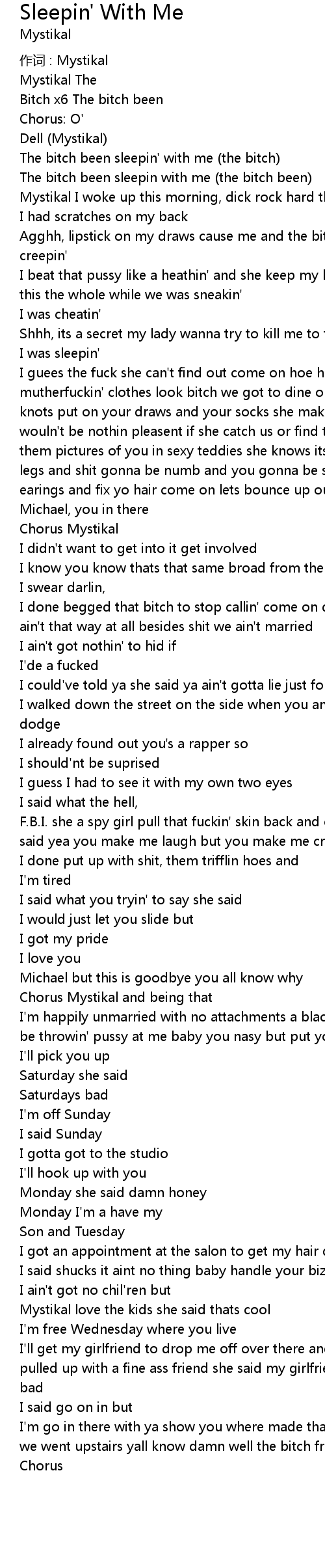 | I'm go in there with ya show you where made that old girl stay down stairs while we went upstairs yall know damn well the bitch freind been sleepin' with me | |