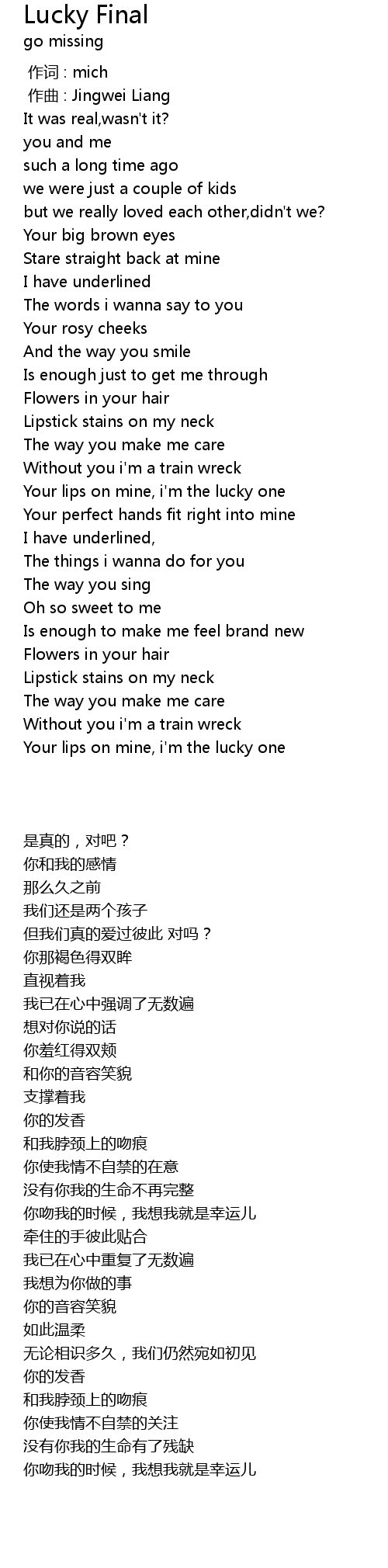 | [01:17.55] | Your lips on mine, i' m the lucky one |