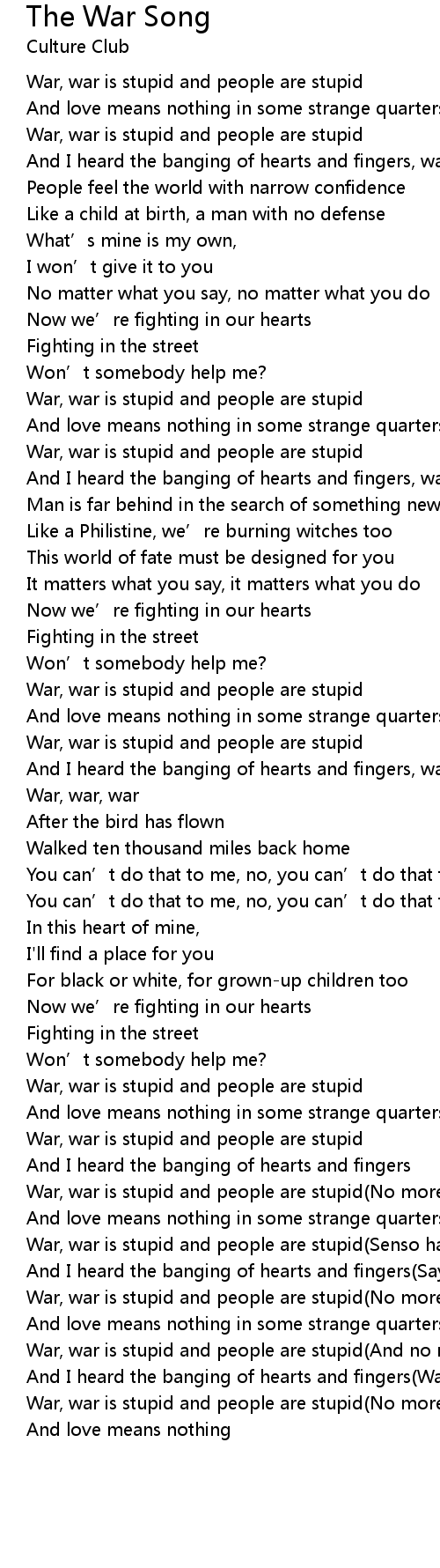 | And I heard the banging of hearts and fingers(Say no more war, say no more war) | |