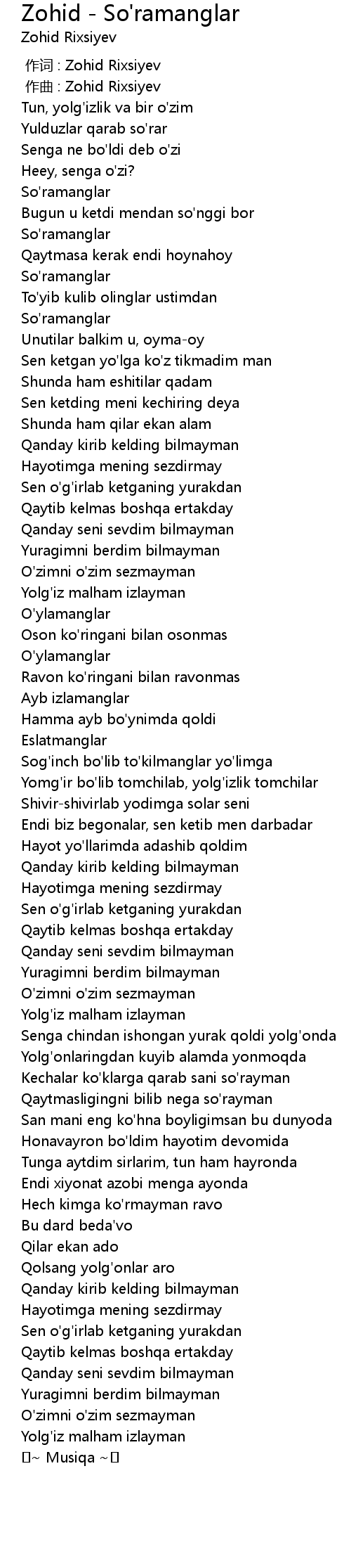 | [00:00.000] | 作词 : Zohid Rixsiyev |