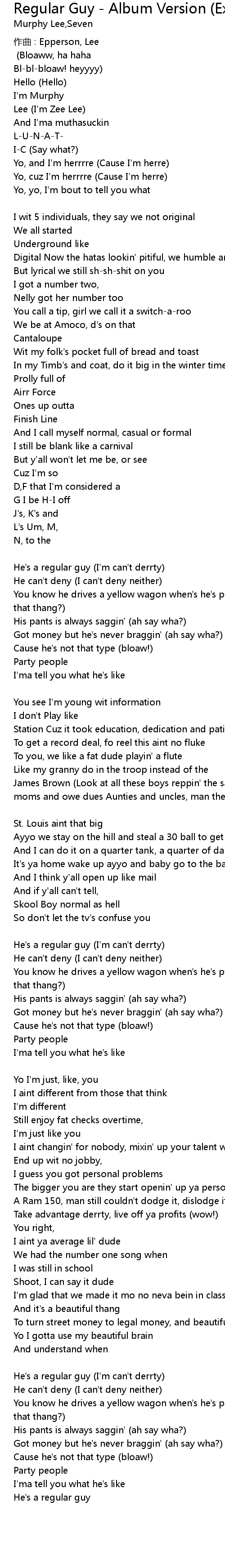 | " Regular Guy" feat. Zee Intro: Murphy Lee Zee Bloaww, ha haha Blblbloaw! heyyyy | |