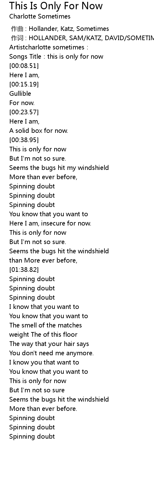 | [00:00.668] | 作词 : HOLLANDER, SAM/KATZ, DAVID/SOMETIMES, CHARLOTTE |