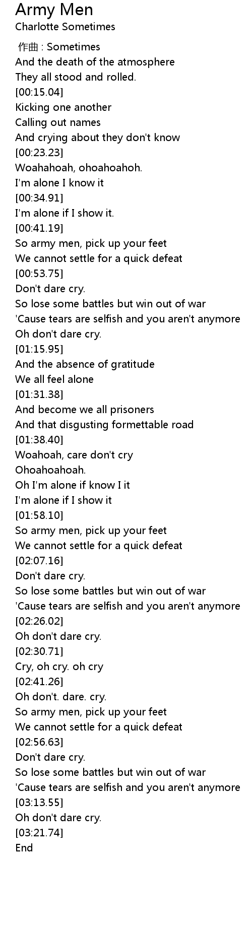| [00:43.95] | So army men, pick up your feet |