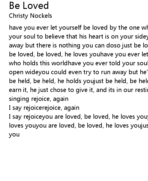 | have you ever let yourself be loved by the one who made youhave you ever told your soul to believe that his heart is on your sideyou could even try to run away but there is nothing you can doso just be loved, be loved, he loves youjust be loved, be loved, he loves youhave you ever let yourself be held by the one who holds this worldhave you ever told your soul to rejoice that his arms are open wideyou could even try to run away but he' d come running after youso just be held, be held, he holds youjust be held, be held, he holds youwe didn' t earn it, he just chose to give it, and its in our resting that we rise up singing rejoice, again | |