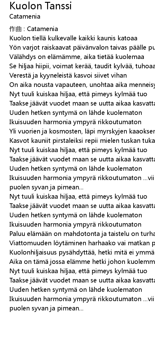 | Ikuisuuden harmonia ympyr rikkoutumaton ... viimein koittaa aika uusi tuon puolen syvan ja pimean... |