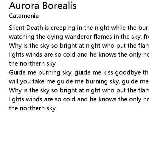 Guide me burning sky, guide me kiss goodbye the freezing night northern lights, will you take me guide me burning sky, guide me |