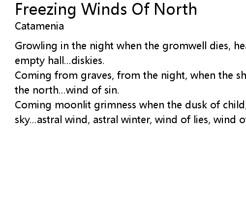 | Coming moonlit grimness when the dusk of child, nebulah winter rises from the sky...astral wind, astral winter, wind of lies, wind of sin. |