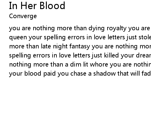 | you are nothing more than dying royalty you are nothing more than a fading drama queen your spelling errors in love letters just stole your crown you are nothing more than late night fantasy you are nothing more than a rehearsed tragedy your spelling errors in love letters just killed your dream just killed you you are nothing more than a dim lit whore you are nothing more than a crashing bore in your blood paid you chase a shadow that will fade out as pain |