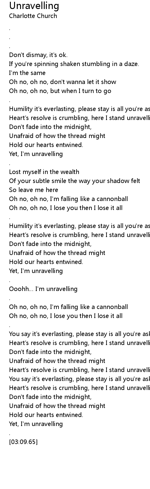 | [02:36.09] | Heart' s resolve is crumbling, here I stand unravelling. |