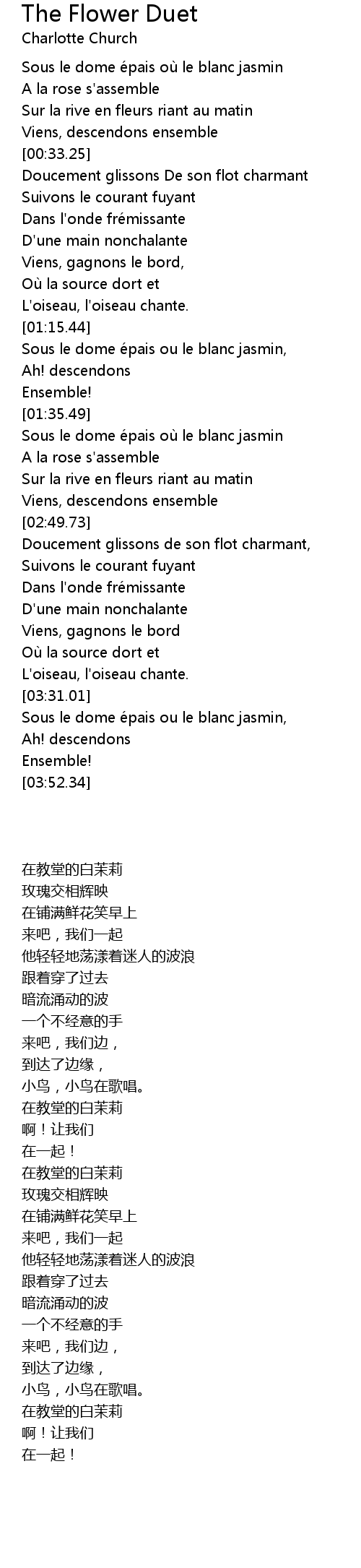 | [00:07.56] | Sous le dome é pais où le blanc jasmin |