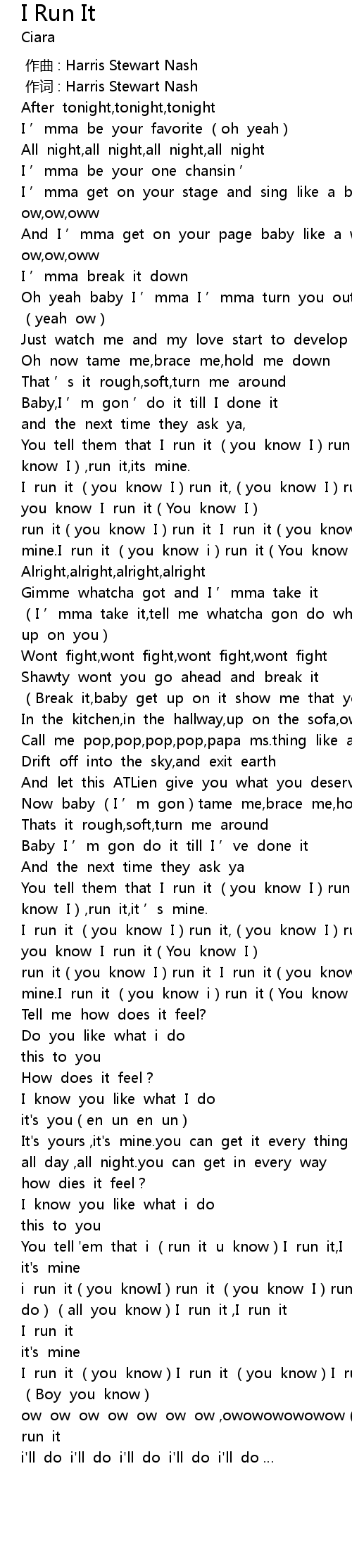 | [04:18.55] | i run it(you knowI)run it (you know I)run it(if i do)(all you know)I run it ,I run it |