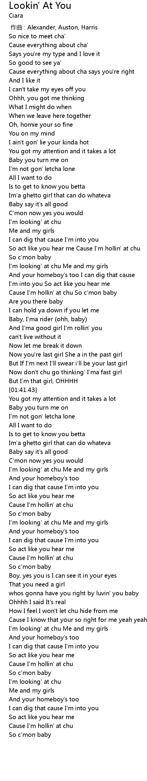 | [02:00.25] | I'm looking' at chu Me and my girls |