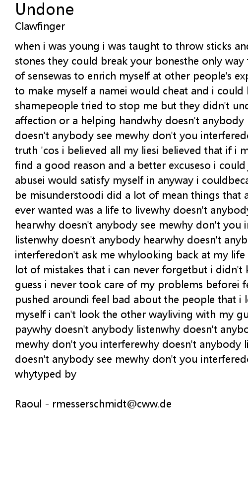 when i was young i was taught to throw sticks and stonesbecause sticks and stones they could break your bonesthe only way to get ahead that made any kind of sensewas to enrich myself at other people's expensei could walk over corpses to make myself a namei would cheat and i could lie without showing no shamepeople tried to stop me but they didn't understandi wasn't looking for affection or a helping handwhy doesn't anybody listenwhy doesn't anybody hearwhy doesn't anybody see mewhy don't you interferedon't ask me whyi never told the truth 'cos i believed all my liesi believed that if i made my own alibisi would find a good reason and a better excuseso i could justify my hate and my self abusei would satisfy myself in anyway i couldbecause i knew that i would always be misunderstoodi did a lot of mean things that are hard to forgivebut all i ever wanted was a life to livewhy doesn't anybody listenwhy doesn't anybody hearwhy doesn't anybody see mewhy don't you interferewhy doesn't anybody listenwhy doesn't anybody hearwhy doesn't anybody see mewhy don't you interferedon't ask me whylooking back at my life there's a lot i regreti made a lot of mistakes that i can never forgetbut i didn't know better i was insecurei guess i never took care of my problems beforei feel bad about the people that i pushed aroundi feel bad about the people that i let downi put the blame on myself i can't look the other wayliving with my guilt is the price i have to paywhy doesn't anybody listenwhy doesn't anybody hearwhy doesn't anybody see mewhy don't you interferewhy doesn't anybody listenwhy doesn't anybody hearwhy doesn't anybody see mewhy don't you interferedon't ask me whydon't ask me whytyped by |